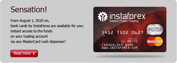 InstaForex Company is the first Broker which gives an opportunity to the client to withdraw his/her funds from the trading account directly to VISA card. It does not matter where and by whom the card was issued. Moreover, you can deposit trading account via credit card with the help of phone verification electronic system, that is much quicker and safer than sending scanned copy of the card by e-mail.