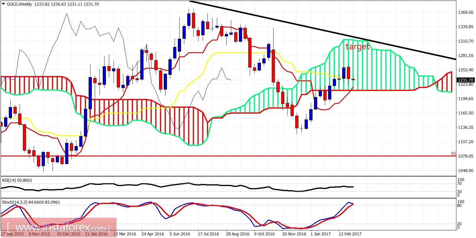 Very bad weekly candle was made last week; however, $1,220 support was held and as the tenkan-sen (red line indicator) is coming fast upwards from lower levels, we might find support at $1,220 stronger than initially expected and a cross between the tenkan- and kijun-sen could provide a bullish signal. Overall, my longer-term view remains bullish.