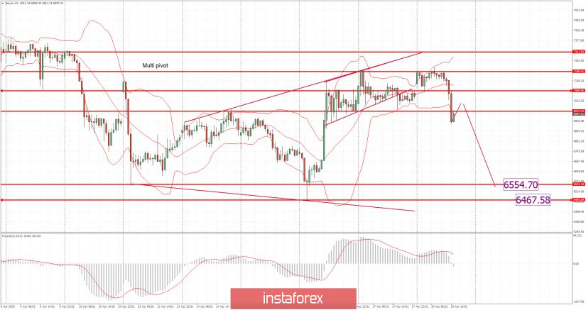 BTC has been trading downwards as I expected. The price did break of the important support at $6,970 and confirmed further downside movement. My analysis from Friday is still active and the downside targets are set at the price of $6,555 and $6,460.