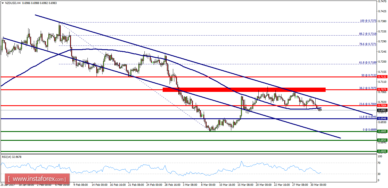 • The NZD/USD is still trading around the spot of 0.7004. Thus, the NZD/USD pair did not make any significant movements yesterday. There are no changes in our technical outlook. The pair has already formed minor resistance at 0.7004 and the strong resistance is seen at the level of 0.7075 because it represents the weekly resistance 1. Moreover, the NZD/USD pair is still moving around the zone of 0.7075 (major resistance). So, major resistance is seen at 0.7075, while immediate support is found at 0.6946. If the pair closes below the price of 0.6946, the NZD/USD pair may resume its movement to 0.6850 to test the daily support 2. The NZD/USD pair is expected to trade between the levels of 0.7004 and 0.6850. The RSI is still calling for a strong bearish market since two weeks. The current price is also below the moving average 100. As a result, sell trades are recommended below the double top of 0.7004 with targets at 0.6869 and 0.6850. However, stop loss should always be taken into account; accordingly, it will be useful to set the stop loss above the last bullish wave at the level of 0.7075. Additionally, the pair will probably decline because the downward trend is still strong.