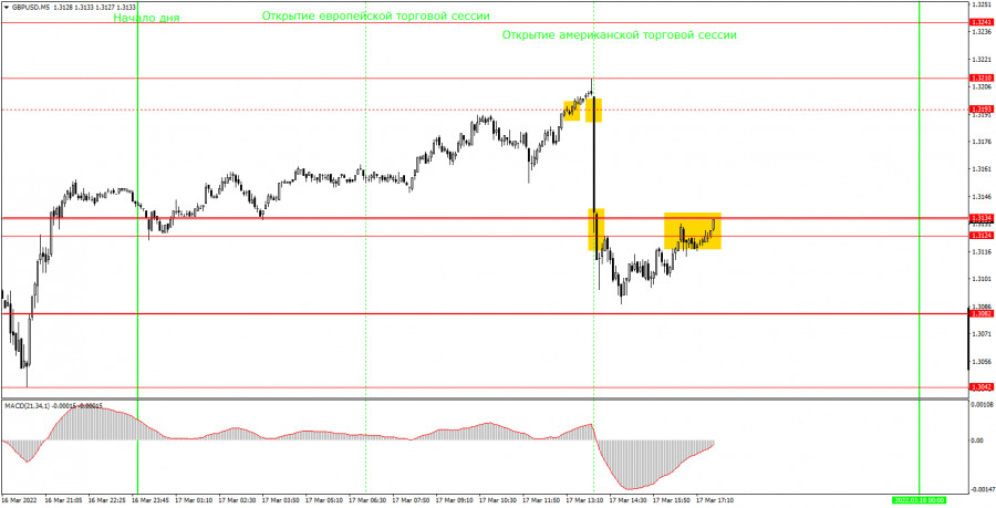 Пара GBP/USD в четверг продолжала восходящее движение, которое началось еще несколько дней назад. В принципе, с точки зрения технического анализа, это движение было вполне логичным. Нелогичным оно было с точки зрения фундаментального анализа, так как вчера вечером ФРС повысила ставку на 0,25% и объявила о готовности еще 6 раз повысить ставку в этом году. А любое ужесточение монетарной политики обычно оказывает поддержку национальной валюте. Однако ничего такого не произошло в среду, не произошло и в четверг на европейской сессии, когда европейцы также имели возможность отработать результаты заседания ФРС. Все изменилось, когда свои результаты опубликовал Банк Англии. Несмотря на то, что он тоже повысил ставку на 0,25%, тоже обозначил намерения бороться с инфляцией ужесточением монетарной политики, фунт стерлингов рухнул вниз, как подкошенный. Потери составили 100 пунктов всего лишь за 1 час. Правда, чуть позже рынок начал восстанавливаться от этого падения и в данное время пара фунт/доллар вновь растет. Это именно то, о чем мы предупреждали ранее: реакция рынка далеко не всегда бывает логичной и вчера и сегодня мы как раз имели возможность видеть это. Все ключевые уровни попросту игнорировались под натиском фундамента.